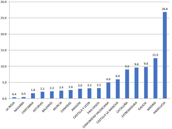 Figure 2 shows the distribution of the ESF funds among the Spanish regions for the period 2014–2019. It shows how Andalusia (26.8%) and Madrid (12.5%) are the regions that received the most funds during the period. On the contrary, Navarra (0.5%) and La Rioja (0.4%) were the ones that received the least.