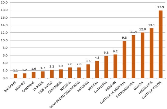 Figure 3 shows the distribution of the EAFRD among the regions for the period 2014–2019. Castilla and Leon (17.9%), Andalusia (13.1%) and Galicia (12%) are the ones that have received the most outstanding amount of resources from the EU. On the contrary, the Region that received the least funds were Madrid (1.2%) and the Balearic Islands (1.1%).