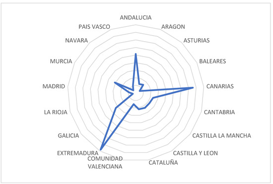 Figure 5 shows how Extremadura, the Canary Islands, and Andalusia have obtained funds concerning environmental efficiency above the Spanish average.