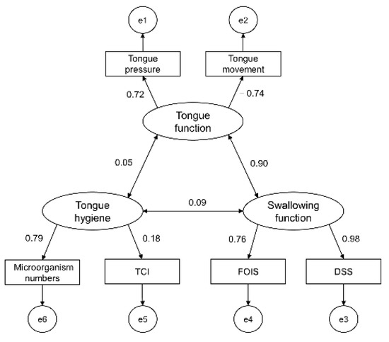 Standardized path coefficients GFI = 0.977, AGFI = 0.932, RMSEA = 0.000; el to e6 are error variables. Tongue function: tongue hygiene: swallowing function. GFI, goodness of fit index; AGFI, adjusted goodness of fit index; RMSEA, root mean square error of approximation.