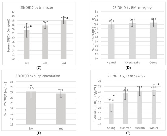 Serum 25-OH-D concentrations (ng/mL) by marital status (A), location (B), pregnancy trimester (C), pregestational BMI category (D), supplementation (E) and by last menstrual period (LMP) (F). Unadjusted linear regression. * p < 0.05.