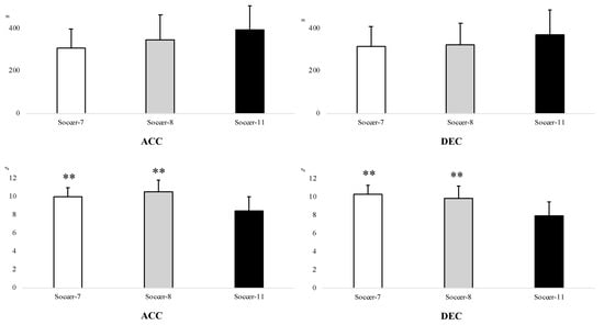 | Soccer-8 | 13.9 ± 5.2 ** | 292 ± 118 | 1189 ± 453 ** | 1305 ± 516 ** | 473 ± 239 ** | 92.1 ± 69.4 ** | |