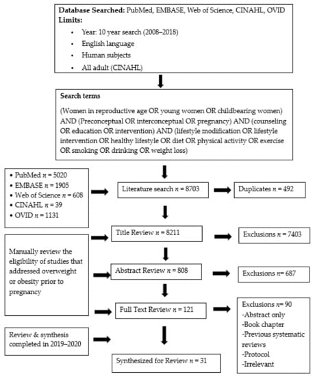 The electronic databases PubMed, Cumulative Index in Nursing and Allied Health Literature (CINAHL), Ovid, Scopus, Web of Science, and Embase were used for the search. Articles were retrieved that were published over a ten-year period from 2009 to 2018 with article reviews occurring in 2019 and final synthesis in 2020. A combination of search terminologies related to the integrative review topic was used (i.e., women of reproductive age; young women; childbearing women), preconception, education (i.e., counseling; education; intervention), and lifestyle (i.e., lifestyle modification; lifestyle intervention; healthy lifestyle; diet; physical activity; exercise; weight loss). To conduct a comprehensive review of the literature on preconception counseling, the terms of overweight or obesity were not included in the search terminology to prevent the inclusion of studies that included only women with overweight or obesity. Rather, the investigators manually reviewed each article during the title, abstract and full-text review steps to check the eligibility of studies that addressed overweight or obesity prior to pregnancy.
