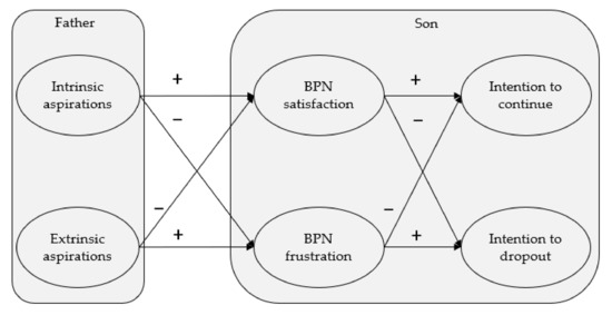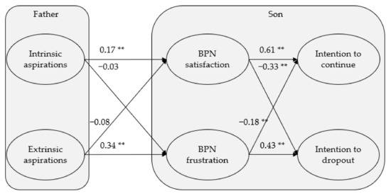 As expected, a positive correlation was found between the intrinsic aspirations of the fathers and BPN satisfaction, and between the extrinsic aspirations of the fathers and BPN frustration. BPN satisfaction was positively associated with the intention to continue and negatively correlated with the intention to drop out. Conversely, BPN frustration was negatively associated with the intention to continue and positively correlated with the intention to drop out (see Table 2).
