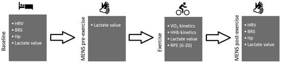 Then, participants come to our laboratory for the exercise sessions. The procedure followed 4 stages: baseline; MENS-pre-exercise; exercise; and MENS-post-exercise, as illustrated below (Figure 1).