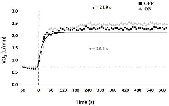 Oxygen uptake kinetics. Figure 2 shows VO2 on-kinetic analysis, in both conditions, for a typical subject. A slow component was observed in both experimental conditions, with non-significant slightly higher value during OFF than the ON condition (4.3% vs. 3.7%). Mean oxygen kinetic parameters for the exponential curve fitting are shown in Table 2. Analysis showed a slower primary component (t(9) = −3.38; p = 0.004; mean diff. = 3.25; d = 0.60), with a slower mean response time (t(9) = −2.57; p = 0.015; mean diff. = 4.88; d = 0.66) and a shorter time delay of the slow component (t(9) = 1.90; p = 0.045; mean diff. = −29.83; d = −0.70) during ON in comparison to the OFF condition. Moreover, VO2 at the steady-state level was higher during ON than it was in the OFF condition (t(9) = 2.90; p = 0.010; mean diff. = 0.14; d = 0.26). We did not find any significant differences for the increase in VO2 per unit increase in work rate (the gain of the primary phase), with values corresponding to 9.14 ± 0.5 and 9.05 ± 0.5 mL/min/W during the OFF and ON condition, respectively.
