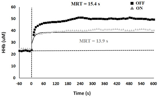 As shown in previous studies [40,41], the NIRS-derived HHb signal provides a continuous, noninvasive measurement of changes in muscle deoxygenation and reflects the balance between local muscle O2 delivery and utilization. Our results have shown an immediate increment in muscle fractional O2 extraction after a few seconds of delay (≈10 s) following the onset of contraction. The rate of adaptation of muscle deoxygenation was faster than the adaptation of the primary phase of the VO2, reflecting an accelerated O2 extraction in the active muscle microvasculature as a consequence of microstimulation. Our results are in agreement with other studies that investigate increasing the availability of muscle O2; through hyperoxia, adenosine, or drug administration to the O2–hemoglobin dissociation curve, which facilitated O2 release at the working muscle, the primary component of pulmonary VO2 does not accelerates, even during high-intensity exercise [42,43]. This is in accordance with the hypothesis that VO2 during the transition from rest-to-exercise is not managed by the rate of adjustment of convective oxygen delivery to the exercising muscles [42]. After the time delay, during the ON condition, HHb increased more rapidly toward a “steady-state” level, suggesting that oxygen delivery in the on-transition was more adequate to meet the metabolic demand of the muscle, thus requiring a rapid increase in O2 extraction [41]. The slightly lower but not significantly different muscle HHb value exhibited by MENS stimulation at steady-state level, in concomitant with the significantly higher value of VO2 consumption at the same working rate, suggests that our procedure may have improved oxygen availability/distribution within the muscle microvasculature. The cause of the slower phase II of VO2 kinetics is unclear, although it is known that this parameter is sensitive to a number of factors, including the high percentage of type II fiber distribution in the working muscles [44]. However, it is difficult to see how MENS stimulation could alter muscle fiber recruitment patterns, although this should not, of course, be excluded yet.