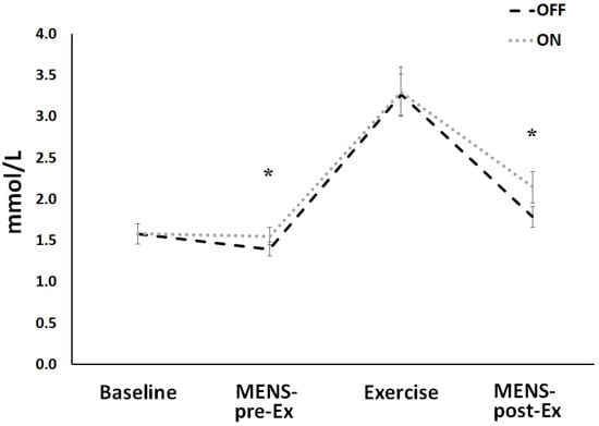 Mean (±SD) lactate values recorded at the baseline, after the first MENS treatment (MENS-pre-Ex) before exercise, at the third minute of the constant-load exercise (Exercise), and after the second MENS treatment (MENS-post-Ex), subsequently to exercise performance. Black dashed line represents OFF, the gray dashed line represents ON condition. Asterisks showed mean significant differences at p < 0.05.
