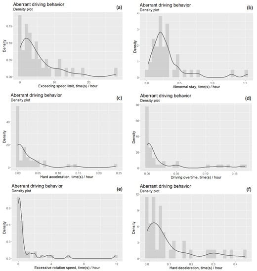 Figure 1 shows the density plots of six aberrant driving behaviors. For discrete data, the sum of the areas of all rectangles in the density plots was always equal to 1; for continuous data, the area under the curve (definite integral) was also equal to 1. If the absolute value of the upper and lower bounds of