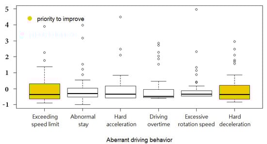 Figure 2. To compare these behaviors, all values have been standardized. From the risk management perspective, an ideal plot would contain a short box with short whiskers and few outliers, meaning that the data were centralized. For truck companies, aberrant driving behavior should ideally occur rarely, with minimal variance in the frequency of occurrence.