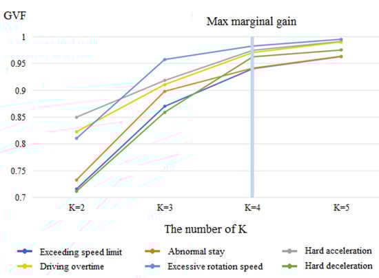After calculating the GVF for each k classification of aberrant driving behavior, the elbow method was applied to determine the appropriate number of subgroups (k). The elbow method examines the percentage of variance that can be explained and determines a marginal gain that occurs by changing the value of k. We selected a set of k clusters thus that adding another cluster would not give much better modeling results for the dataset [