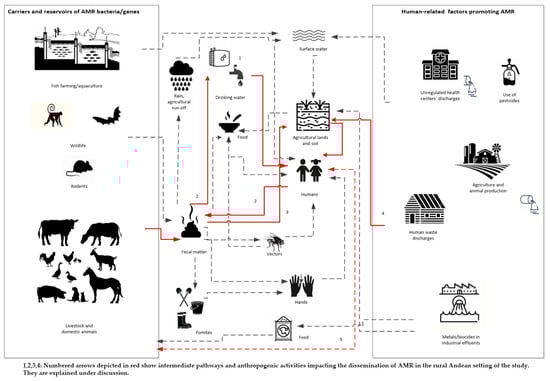 Using the One Health approach, we tried to establish a AMR bacteria dissemination pathway, and evaluated how the AMR bacteria could spread, and how AMR drivers would prompt the dissemination in Cajamarca’s rural setting (Figure 1). We found evidence for specific pathways, and these are represented in red solid lines in Figure 1.