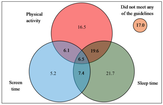 The Venn diagram shows that nearly half (48.7%) of the children met the physical activity guidelines (Figure 1). More than half of the children (55.2%) met the sleep guidelines while a quarter (25.2%) of the children met the screen time guidelines. A total of 17% of preschoolers did not meet any of these behavior guidelines; while only 6.5% of preschoolers met all three guidelines for physical activity, screen time and sleep time.