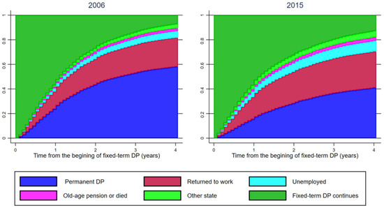 The cumulative incidence of permanent disability pension, return to work, and the four other states during the follow-up time of four years is first illustrated among those who started their fixed-term disability pension in 2006 or 2015.