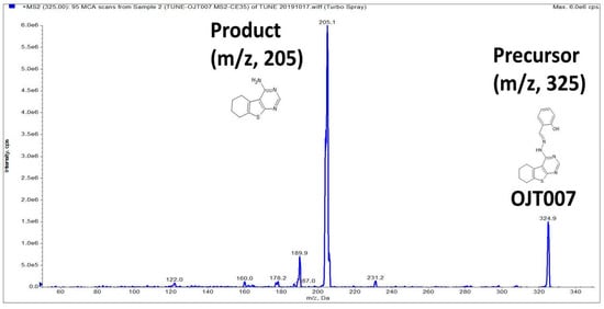 Product ion scan spectra for OJT007 (m/z 324.9→205.1).