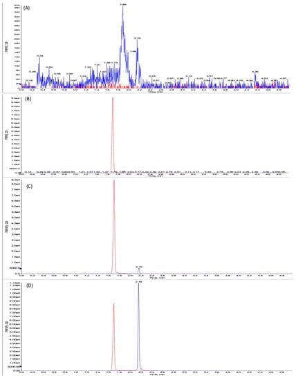 In order to examine the extraction recovery and matrix effect, QC samples were evaluated at three concentration levels (15, 75 and 750 ng/mL, n = 6). The extraction recovery and matrix effect were calculated according to Equations (1) and (2).