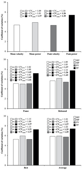 Descriptive data are presented as means and SDs, whereas the CV and ICC are presented through their median values and range. The normal distribution of the data was confirmed using the Shapiro–Wilk test (p > 0.05). Paired samples t-tests and standardized mean difference (Cohen’s d effect size [ES]) were used to compare the magnitude of the different variables between both testing sessions. The criteria to interpret the magnitude of the ES was the following: trivial (<0.20), small (0.20–0.59), moderate (0.60–1.19), large (1.20–2.00), or very large (>2.00) [33]. Between-session reliability was assessed by the standard error of measurement (SEM), the CV (standard error of measurement/participants’ mean score × 100) and the ICC (model 3.1) with their corresponding 95% confidence intervals. Acceptable reliability was determined as a CV < 10% and ICC > 0.70 [34]. The ratio between 2 CVs was used to compare the reliability between the 4 variables (MV, MP, PV, and PP), 2 exercise techniques (pause and rebound), and 2 repetition criteria (best and average). The smallest important ratio between 2 CVs was considered to be higher than 1.15 [35]. The reliability analysis was performed through a custom spreadsheet [36]. Alpha was set at 0.05.