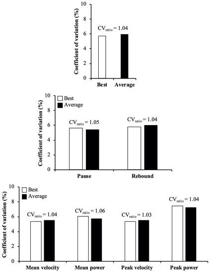 Routine testing procedures often require participants to perform multiple repetitions against the same load [10,11,14,22]. Practitioners then need to decide whether the best (i.e., the highest) or the average value of these repetitions will be used for comparative analyses. Some studies have used the average score of all repetitions [10,11,14,15,22], other studies have used the best score [23,25], and others did not directly specify the repetition criteria used for data analysis [12,19]. Given the diversity of repetition criteria, previous research has explored whether the best or average scores are more appropriate as an indicator of physical performance [26,27,28,29]. For example, Claudino et al. [27] showed that the average countermovement jump (CMJ) height was more sensitive than the highest CMJ height for monitoring the neuromuscular status. Similarly, Bishop et al. [26] reported greater consistency for the inter-limb differences evaluated in the isometric squat, CMJ, and drop jump exercises using the average score compared to the best score of each limb. However, Rios et al. [28] found that the reliability of throwing velocity in different handball throwing tests was comparable when the best score of 4 trials, average score of 4 trials, and the average score of the 3 best trials were considered for the analyses. Therefore, to shed more light on this topic, it seems important to elucidate whether the reliability of the different performance variables collected during the back-squat exercise are affected by the repetition criterion.