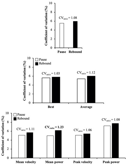 Reliability comparisons between pause (white bars) and rebound (black bars) techniques of the back-squat exercise. Bars represent the median coefficient of variation value obtained combining the 2 repetition criteria and 4 variables (upper panel), the 4 variables separately for each repetition criterion (middle panel), and the 2 repetition criteria separately for each variable (lower panel). Numbers depict the ratio between 2 coefficients of variation (CVratio = higher/lower value), while meaningful differences in reliability are indicated in bold (CVratio > 1.15).