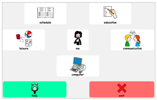 The ASD Module (Fundación Orange, and IMEDIR, A Coruña, Spain) was the tool used during the study and is a free technological application that is made up of a set of virtual keyboards (or adapted interfaces), digital schedules and activities, especially designed and tested by and for this study group and included in the In-TIC PC software (Fundación Orange, and IMEDIR, A Coruña, Spain) [52]. The software is available for the Windows operating system and was implemented with the Visual Studio development tool, .NET environment, C# programming language and Windows Form technology. Other materials used for content development were the Interactive Books Multimedia (LIM, according to the Spanish acronym) software (Macías, F., Lugo, Spain) [53] and Aragonese Portal of Augmentative and Alternative Communication (ARASAAC, according to the Spanish acronym) pictograms [54].