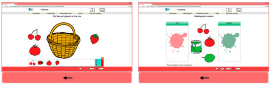 Education. This section includes activities necessary for learning and participation in the school environment. Its contents refer to five basic categories: colours, numbers, letters, parts of the body and feelings. Moreover, dynamic activities have been designed on the same line with the LIM system (see Figure 3).