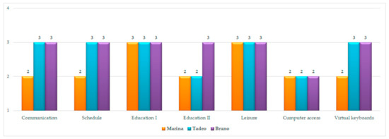 The participants in this study highlighted that the contents they considered most relevant to be developed in the project were related to the following areas: communication, leisure/play, time and activities management and education. These skills are reflected in the ASD module’s contents in the schedule, education, leisure, communication, and computer access sections.