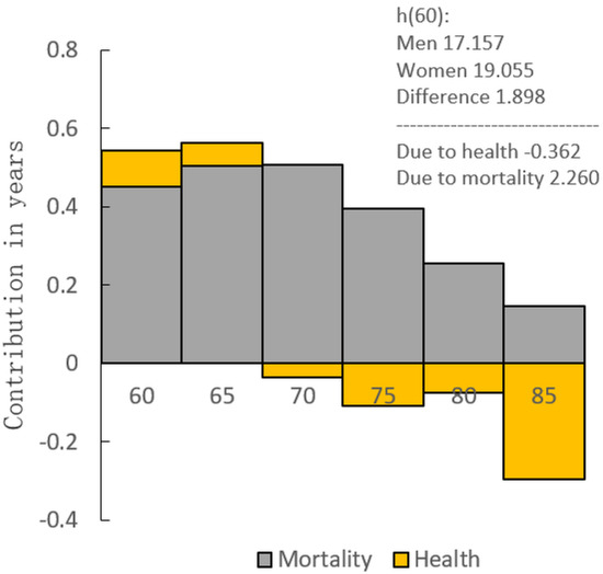 Figure 1 shows that the difference in DFLE between men and women over 60 years is 1.898 years, of which 2.260 years are attributable to the mortality rate, and 0.362 years are due to the disability-free prevalence.