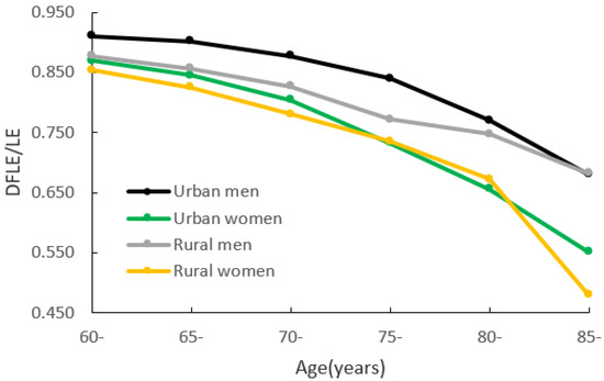 Figure 2 shows the trend of DFLE/LE for men and women in urban and rural areas. The DFLE/LE of 60-year-old urban men is 91.0%, and that of urban women is 87.0%, while the DFLE/LE of 60-year-old rural men is 87.7% and that of rural women of the same age is 85.3%. The DFLE/LE of 85-year-old urban men is 68.0%, and that of urban women is 55.0%, while the DFLE/LE of 85-year-old rural men is 68.2% and that of rural women is 48.0%. Both urban and rural men’s DFLE/LE are higher than the women’s at all ages. The ratio of urban men is always higher than that of rural men (except at age 85). For women, the ratio of urban areas is higher than that of rural areas (except at ages 75 and 80).