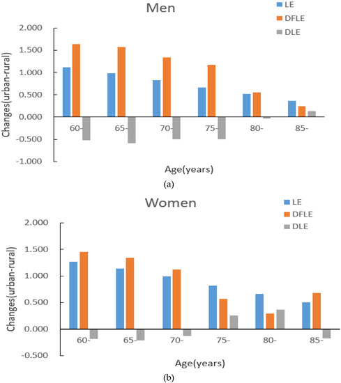 Absolute changes in life expectancy (LE) and disability-free life expectancy (DFLE) between urban and rural areas for men and women. (a) men (b) women.