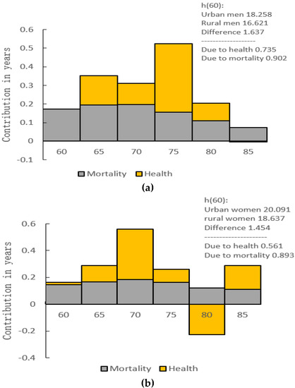 Figure 4 shows that the difference in DFLE between urban and rural men over 60 years is 1.637 years, of which 0.902 years are attributable to the mortality rate, and 0.735 years are due to the disability-free prevalence (the 75-year-old group has the largest contribution at 0.369 years). In addition, the difference in DFLE between urban and rural women over 60 years old is 1.454 years; of which 0.893 years are attributable to the mortality rate, and 0.561 years are due to the disability-free prevalence (the 70-year-old group has the largest contribution of 0.374 years).
