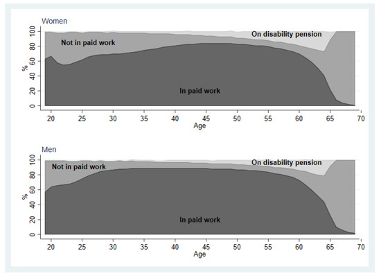 - Claussen, B.; Dalgard, O.S. Disability pensioning: The gender divide can be explained by occupation, income, mental distress and health. Scand. J. Public Health 2009, 37, 590–597. [Google Scholar] [CrossRef]