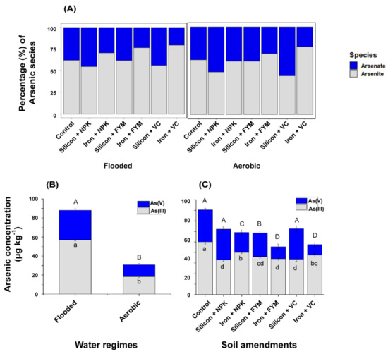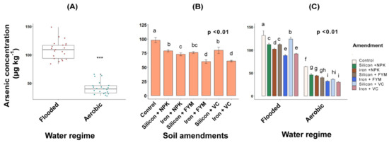 4.2. Inorganic As response in Rice to Water Regimes and Amendments