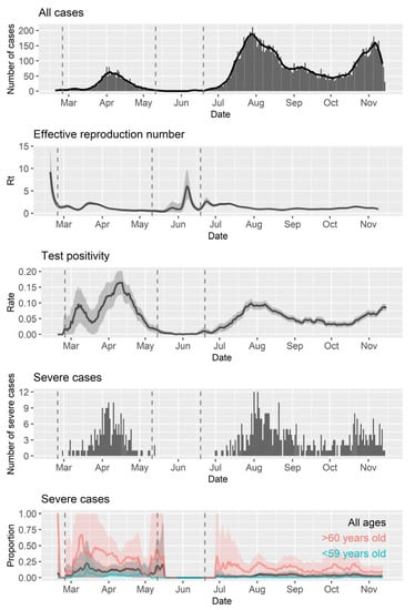 - Cori, A.; Ferguson, N.M.; Fraser, C.; Cauchemez, S. A new framework and software to estimate time-varying reproduction numbers during epidemics. Am. J. Epidemiol. 2013, 178, 1505–1512. [Google Scholar] [CrossRef] [PubMed]