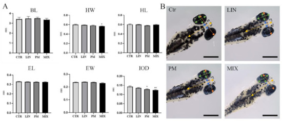 Morphometric analyses showed no statistically significant effect on BL, HL or EL compared to control, after single and combined exposure to sublethal LIN and PM concentrations (Figure 1). A significant (p < 0.05) decrease in HW was observed only for the mixture treatment, while the zebrafish larvae treated with both PM and the mixture treatment also showed a significant reduction (p < 0.05 and p < 0.005 respectively) in the IOD (Figure 1).