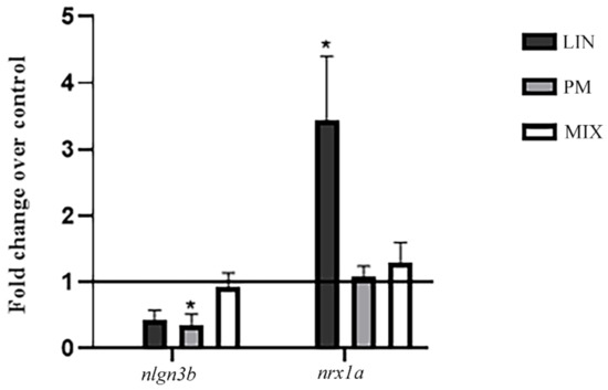mRNA expression levels of nlgn3b and nrxn1a after exposure of zebrafish larvae to LIN, PM and MIX for 96 hpf. The results are expressed as mean ± SEM. * p < 0.05 vs. Ctr.