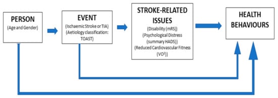 - Present an a priori conceptual model of potential factors influencing health behaviours after stroke or TIA (Figure 1). These include sociodemographic factors (age and gender), stroke-related factors (TOAST classification, stroke or TIA classification) and stroke sequalae (acquired disability, reduced cardiovascular fitness and psychological distress).