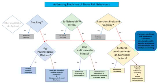 This study described the prevalence of adherence with health behaviours for risk reduction after stroke and examined a range of predictor variables, based on an a priori conceptual model. Despite the study participants’ raised risk for future stroke events [,], the overall proportion adherent with lifestyle-related recommendations addressing smoking, MVPA participation and fruit and vegetable consumption was found to be suboptimal. While the health behaviours reported and the proportion of study participants categorised as overweight and obese by BMI category in this study were equivalent to the available population normative data for a similar age range [], this study suggests that little behaviour change occurred following stroke and presents clear opportunities to enhance secondary prevention after stroke. The levels of adherence with individual behaviours of smoking abstinence, fruit and vegetable consumption and MVPA observed in this study are in line with those reported in other studies after stroke [,,,,]. Where the regression models employed in the current study identified predictors of one or more lifestyle-related, modifiable risk factor for recurrent events, the authors discuss these in detail below and further present a proposed decision tree for interventions to guide clinicians based on the findings of this study (Figure 2).