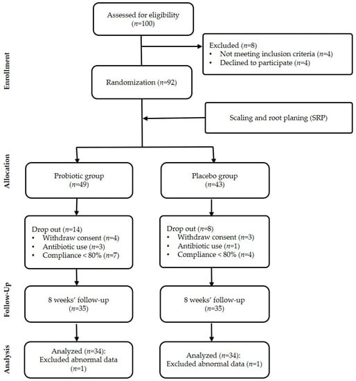 - Kang, M.S.; Lee, D.S.; Lee, S.A.; Kim, M.S.; Nam, S.H. Effects of probiotic bacterium Weissella cibaria CMU on periodontal health and microbiota: A randomised, double-blind, placebo-controlled trial. BMC Oral Health 2020, 20, 243. [Google Scholar] [CrossRef]