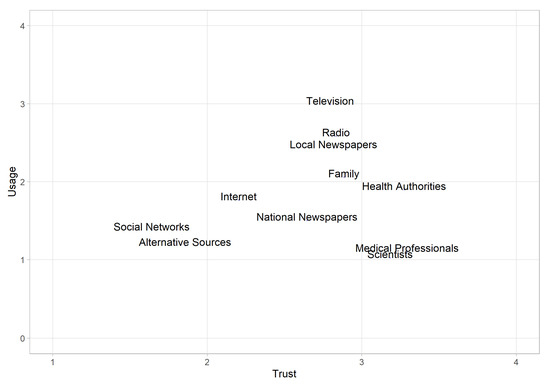 Medical professionals (M = 3.29, SD = 0.68), health authorities (M = 3.27, SD = 0.65), or scientists (M = 3.18, SD = 0.68) were trusted most, followed by family (M = 2.88, SD = 0.75) and then legacy media: radio (M = 2.83, SD = 0.68), local newspapers (M = 2.82, SD = 0.68), television (M = 2.65, SD = 0.82), and national newspapers (M = 2.65, SD = 0.62). At the very end of the credibility list, one finds the Internet (M = 2.20, SD = 0.69), alternative sources of information (M = 1.86, SD = 0.70), and social networks (M = 1.64, SD = 0.72). In addition to the reversed order, the level of homogeneity within the data was striking. Although the scales were identical, the standard deviations in the estimation of trust were only roughly half as large as those in the estimation of usage.