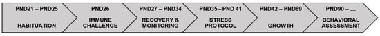 Between PND35 and PND41, half of the animals (SAL/S+ and LPS/S+ groups) were exposed to four different mild stressors on four alternate days. The choice of stress agents was based on previous evidence []: