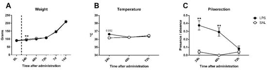 For the sickness assessment, there was found an effect on weight gain (Figure 2A), expectable in growing animals (day effect: F5,230 = 2717.45; p < 0.0001; partial η2 = 1); however, although no differences existed in baseline weight (F1,46 = 0.393; n.s.), treated and untreated animals differed 24 h after LPS administration (F1,46 = 9.69; p < 0.01; partial η2 = 0.861), but differences disappeared at 48 h (F1,46 = 2.5; n.s.). Regarding the temperature data (Figure 2B), an interaction between day and LPS was observed (F2,92 = 3.267; p < 0.05; partial η2 = 0.608), not found in day (F2,92 = 1.201; n.s.) nor LPS effect (F1,46 = 0.855; n.s.) alone; an effect close to significance was found 24 h after injection in temperature (F1,46 = 3.972; p = 0.052; partial η2 = 0.496), but disappeared at 48 h (F1,46 = 0.019; n.s.). Piloerection data showed LPS effect (F1,46 = 17.116; p < 0.001; partial η2 = 0.981), but non-significant trends by day (F2,92 = 2.473; p = 0.089; partial η2 = 0.485) or interaction (F2.92 = 2.875; n.s.) existed. One-way comparisons showed that differences between groups in piloerection can be found at 24 (F1,46 = 9.316; p < 0.01; partial η2 = 0.848) and 48 h (F1,46 = 9.47; p < 0.01; partial η2 = 0.853), but disappeared at 72 h (F1,46 = 0.343; n.s.) after LPS injection (Figure 2C). Nevertheless, no evidence of the remaining signs of sickness (tremor, hunched/flat posture, lacrimation, salivation, or diarrhea) were found in any of the animals. Details can be found in Table 1.
