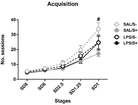 5-choice serial reaction time task (5-CSRT task) acquisition in saline-control (SAL/S-), LPS-control (LPS/S-), saline-stress (SAL/S+), or LPS-stress (LPS/S+) groups (n = 12). Mean number of sessions to criterion are represented at several stimulus durations (SD): 8, 6, 2.5, 1.25, and 1 s; at SD = 1, SAL/S+ (# symbol) group needed significantly fewer sessions than SAL/S- group to reach criterion. Data are represented as mean ± SEM.