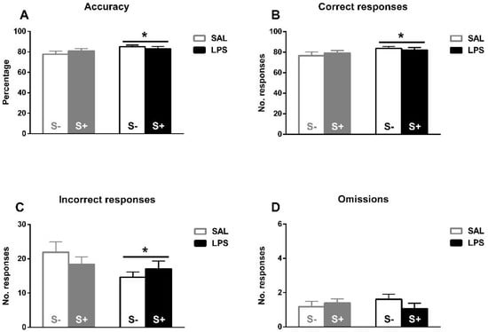 5-CSRT task baseline performance in saline-control (SAL/S-), LPS-control (LPS/S-), saline-stress (SAL/S+), or LPS-stress (LPS/S+) groups (n = 12). (A) Mean accuracy. (B) Mean correct responses. (C) Mean incorrect responses. (D) Baseline mean omissions. Asterisks represent LPS effect: exposed animals a better overall performance in terms of higher accuracy, more correct responses, and less incorrect responses. Data are represented as mean ± SEM.