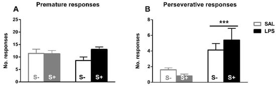 The assessment of inhibitory control, perseverative and premature responses in the 5-CSRT task (Figure 5). Animals exposed to LPS showed an increased compulsive behavior, as an effect exists in perseverative responses (F1,44 = 17.679; p < 0.001; partial η2 = 0.984); however, no effect of stress (F1,44 = 0.088; n.s.) or interaction (F1,44 = 1.469; n.s.) were found. On the contrary, there was no significant effect from LPS exposure (F1,44 = 0.163; n.s.), stress (F1,44 = 2.793; n.s.) or their interaction (F1,44 = 3.102; n.s.) in impulsivity measured by premature responses.