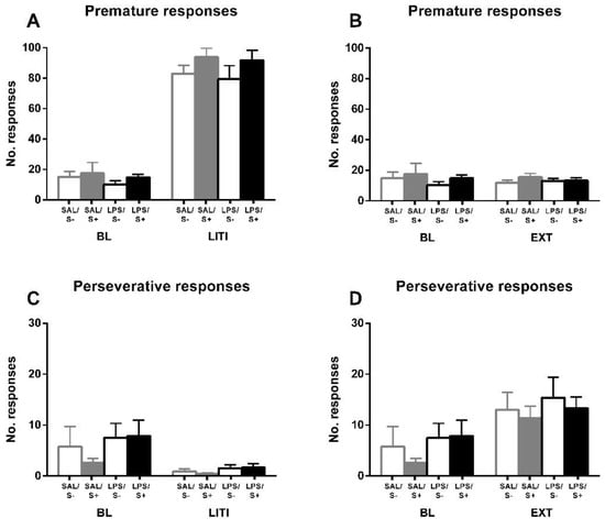 For further exploring the individual differences in inhibitory control, and according to the approach of several authors [,,] previously mentioned, performance under LITI and EXT conditions was measured (Figure 6). LITI dramatically increased impulsive behavior, assessed by premature responses (condition effect: F1,44 = 684.41; p < 0.0001; partial η2 = 1), in all groups equally (LPS effect: F1,44 = 0.861; n.s.; stress effect: F1,44 = 2.956; n.s.; interaction: F1,44 = 0.043, n.s.), while significantly decreasing perseverative responses (condition effect: F1,44 = 15.45; p < 0.001; partial η2 = 0.97) in all groups equally (LPS effect: F1,44 = 2.216; n.s.; stress effect: F1,44 = 0.299; n.s.; interaction: F1,44 = 0.52; n.s.), thus vanishing the baseline effect from LPS (F1,44 = 3.007; n.s.). EXT did not have any effect on premature responses (condition effect: F1,44 = 0.02; n.s.; LPS effect: F1,44 = 1.524; n.s.; stress effect: F1,44 = 1.273; n.s.; interaction: F1,44 = 0.02; n.s.); however, it significantly increased perseverative responses (condition effect: F1,44 = 33.638; p < 0.0001; partial η2 = 0.999) in all groups equally (LPS effect: F1,44 = 1.325; n.s.; stress effect: F1,44 = 0.436; n.s.; interaction: F1,44 = 0.109; n.s.), leading the baseline LPS effect to disappear as well (F1,44 = 0.541; n.s.).