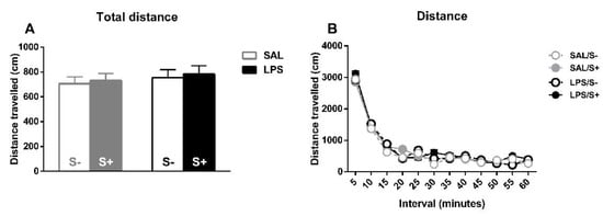 Locomotor activity in saline-control (SAL/S-), LPS-control (LPS/S-), saline-stress (SAL/S+), or LPS-stress (LPS/S+) groups (n = 12). (A) Total distance traveled by the animals on the whole session. (B) Reactivity to novel environment (distance traveled on each five-minute interval). No differences were found concerning LPS or stress in any of these measures, although overall habituation to the cage can be observed in terms of a decrease of distance traveled. Data are represented as mean ± SEM.
