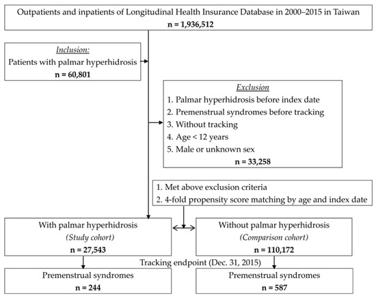 We identified newly diagnosed PH cases (ICD-9-CM disease code 780.8) from 1 January 2000 to 31 December 2015 in the Taiwanese LNHIRD. We evaluated the PH identified by ICD-9-CM diagnosis code 780.8 associated with major adverse cardiovascular events, ischemic stroke and gastroesophageal disease in previous studies [12,14,15]. The date of first visit for PH was assigned as the index date. We defined PMS (ICD-9-CM disease codes 625.4) as the outcome. The end date was the diagnosis of PMS in female patients with PH or the end time of the study. We excluded: (1) PH and PMS patients diagnosed before the study start date (1 January 2000); (2) patients younger than 12 years old (because they had not started menstruating); and (3) patients who were male or with an unidentified sex. The control group consisted of non-PH patients with four-folds matched by sex (female), age and index date meeting the exclusive criteria and then followed to the end of study. The study protocol is shown in Figure 1.