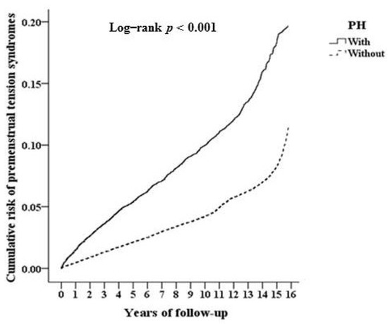 Kaplan–Meier analysis of the cumulative risk of premenstrual syndrome stratified by PH with the log-rank test.