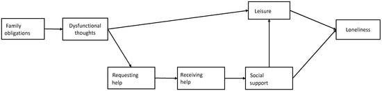 Statistical Package for the Social Sciences (SPSS statistics 22) (IBM, Chicago, IL, USA) and AMOS 6.0 software (IBM, Chicago, IL, USA) were used to carry out the analyses for this study. Considering the small sample size of the group of sons, the associations that are significant at p < 0.10 were highlighted for this group. A p value of 0.05 is considered for the rest of the results. First, descriptive analyses, comparison of means, and independence tests were carried out between the sociodemographic variables assessed and the perception of loneliness. Second, correlation analyses were performed between the different variables for each kinship group (presented as Supplementary Materials). Finally, and following the sociocultural model of stress and coping [11] and the cognitive model adapted to caregiving [12,16], we assessed the fit of the data to the model presented in Figure 1 through path analysis. The cultural variable of family obligations is taken first, followed by dysfunctional thoughts and caregiver resources (asking for help, receiving help, social support and engagement in leisure activities) and, finally, the feeling of loneliness. The associations found in the model for each of the kinship groups were analyzed. The following indices were used to assess the fit of the data from the model: chi-square, incremental fit index (IFI), comparative fit index (CFI), and the root mean square error of approximation (RMSEA).