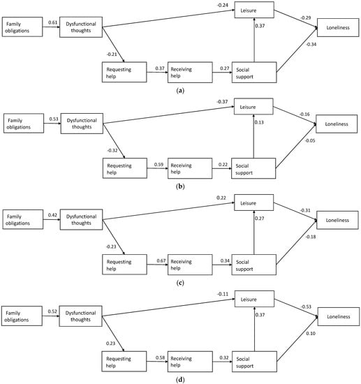 Finally, in the case of caregiver sons, the data obtained are somewhat different from the other groups. In this case, despite finding the significant association observed in all groups between family obligations and dysfunctional thoughts, dysfunctional thoughts were not significantly associated in sons with asking for help or with leisure. As with husbands, the pathway that seems to influence the feeling of loneliness most is that by requesting less help, less help is received, less social support is perceived, there is less engagement in leisure activities, and this influences loneliness. The percentage of variance explained in sons is 25%.